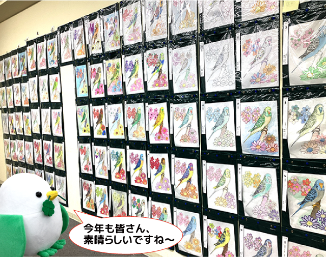今年の塗り絵課題は「インコ」・「ブレーメンの音楽隊」・「夏の縁側」・「電車とひまわり」の4題。どの課題作品も見ごたえのある個性豊かな塗り絵が揃い、訪れた職員の目を楽しませてくれました。